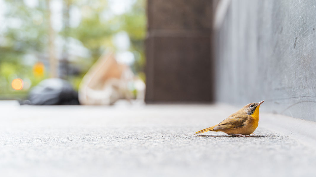 A stunned (but alive!) Common Yellowthroat after striking a window. Most birds that strike windows die on impact or remain motionless staring at wallls, making them vulnerable. We transport injured birds to the Wild Bird Fund, NYC's primary avian clinic.